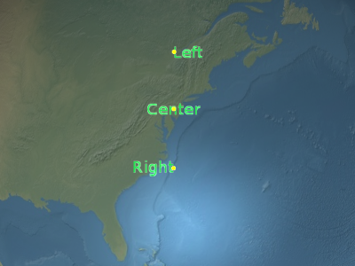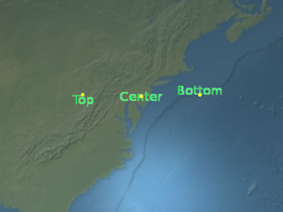 Below, the label is positioned at the center of the Earth but an eye offset makes it always appear on top of the Earth regardless of the viewer's or Earth's orientation.